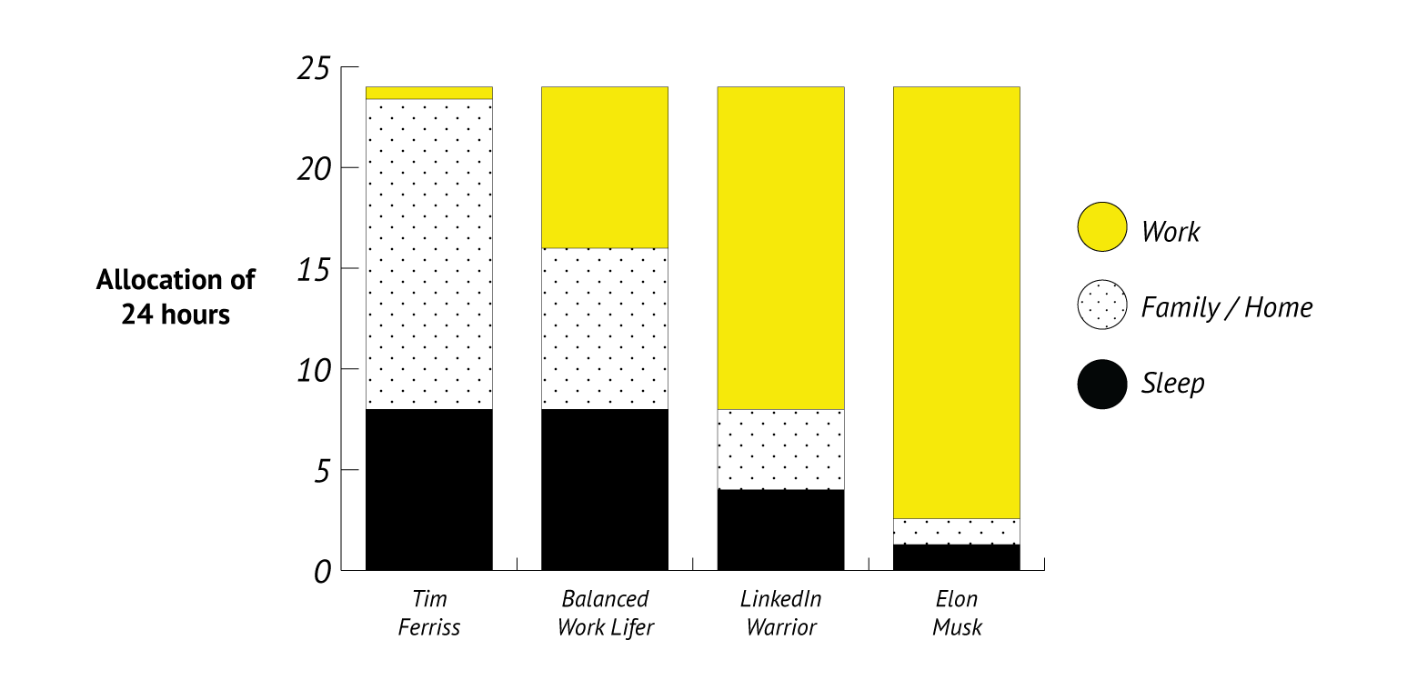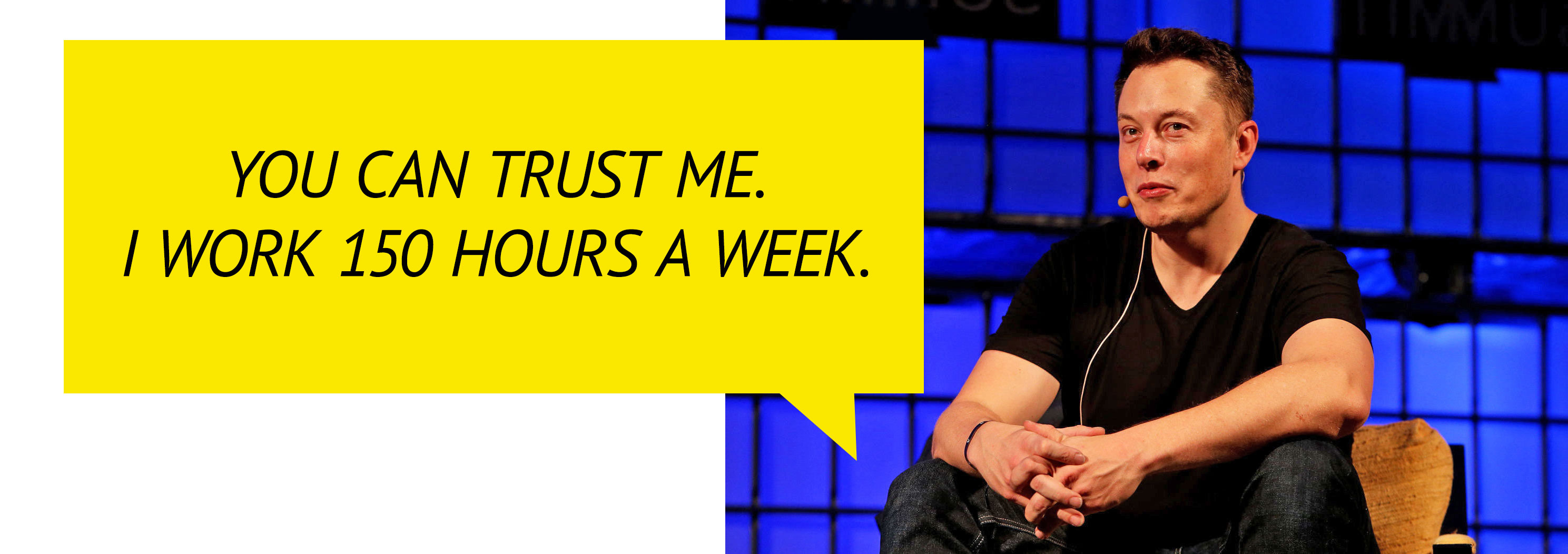 FUNNY: In the photos of our work/life storytellers, I found 2 images of our most famous examples: Tim Ferriss and Elon Musk. Apparently, thought leaders and cool CEOs are most credible while on stage, seated in a low chair, wearing a V-neck tee. Tim Ferriss is also wearing a blazer so that he doesn’t look too lazy (4 hours of work a week), and Elon Musk rocked only the T-shirt to prove that he is still relatable (even as he works 150 hours a week.) ?