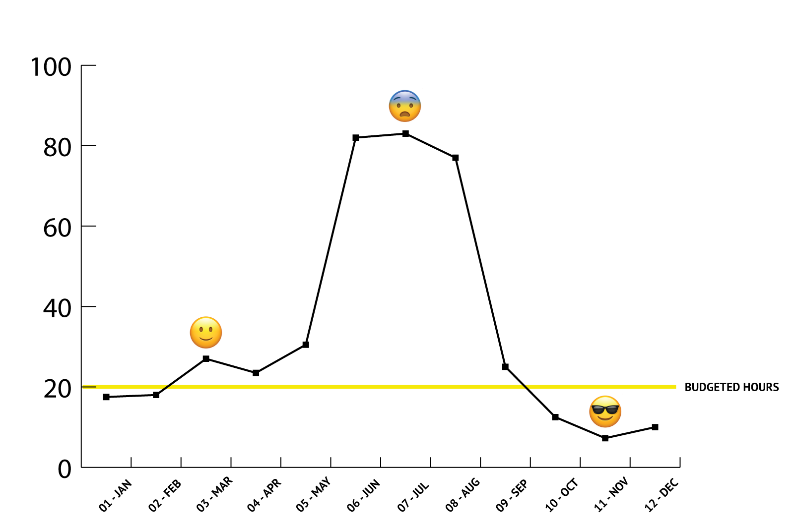 Balance can happen, but it won’t last long. Let me give an example. The graph below is a real-life story of a client that we have on a retainer. Our service agreement specifies that we spend 20 hours a month taking care of their design and marketing projects.