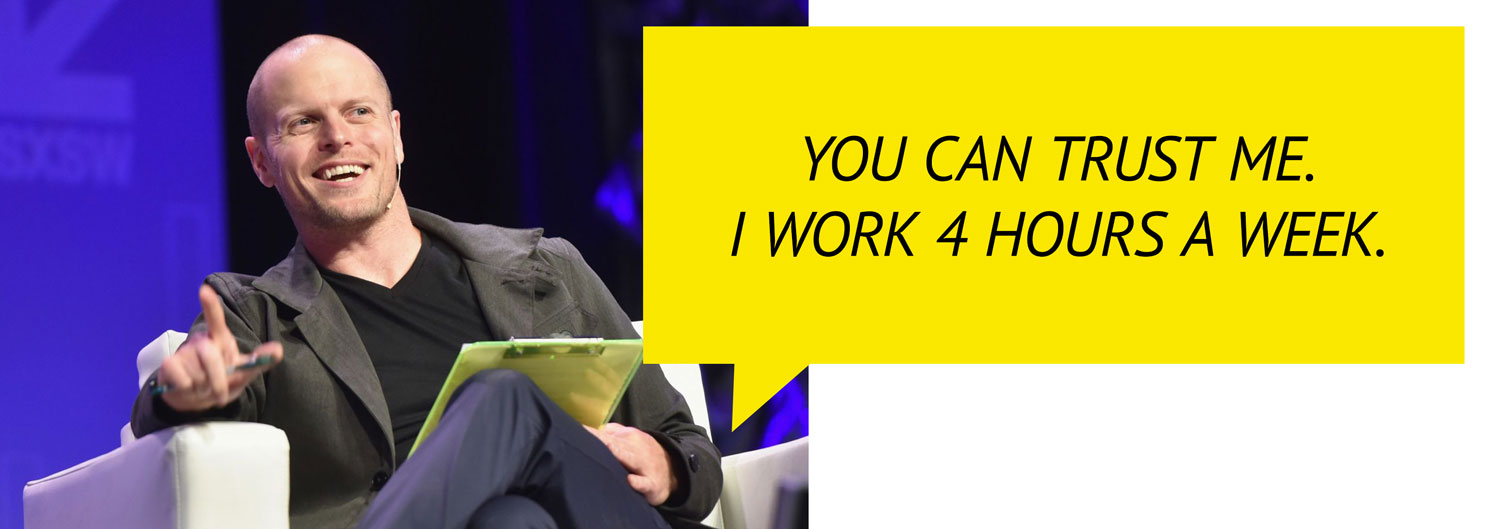 Trope A: Tim Ferriss – On his website, he claimed to work only 4 hours a week, and then wrote the book to show people how to be like him. He got rich from his book sales and has admitted that maybe he worked more than 4 hours per week or something. (In the years since, he has crafted more compelling ideas, but we can’t forget that this 4-hour work week thing really did happen.)