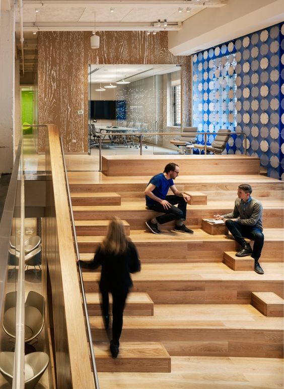 BONUS: There’s something calming about the two “bleacher style” meeting spaces above–the natural wood.