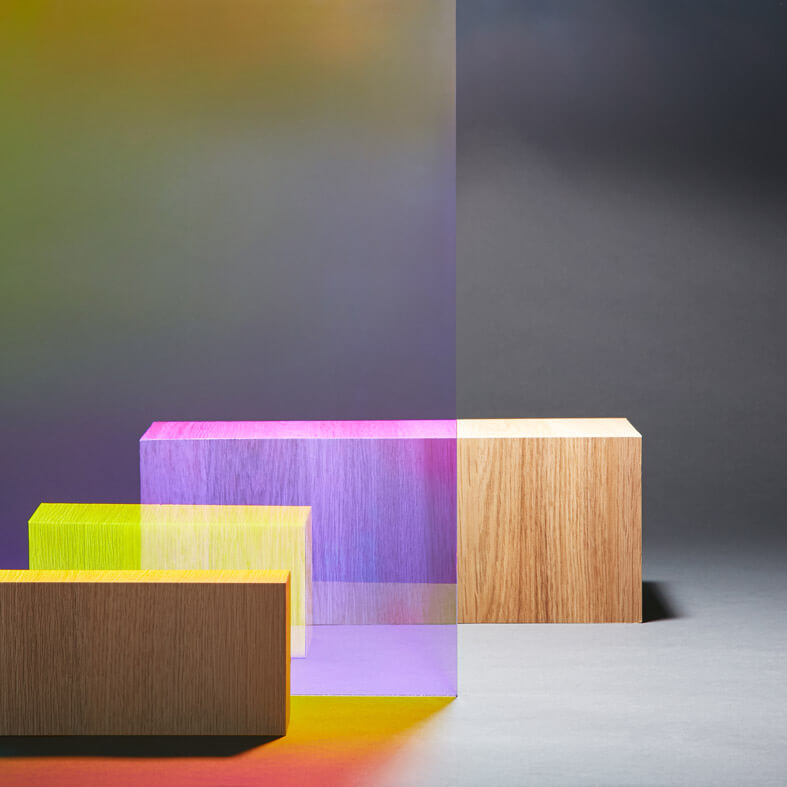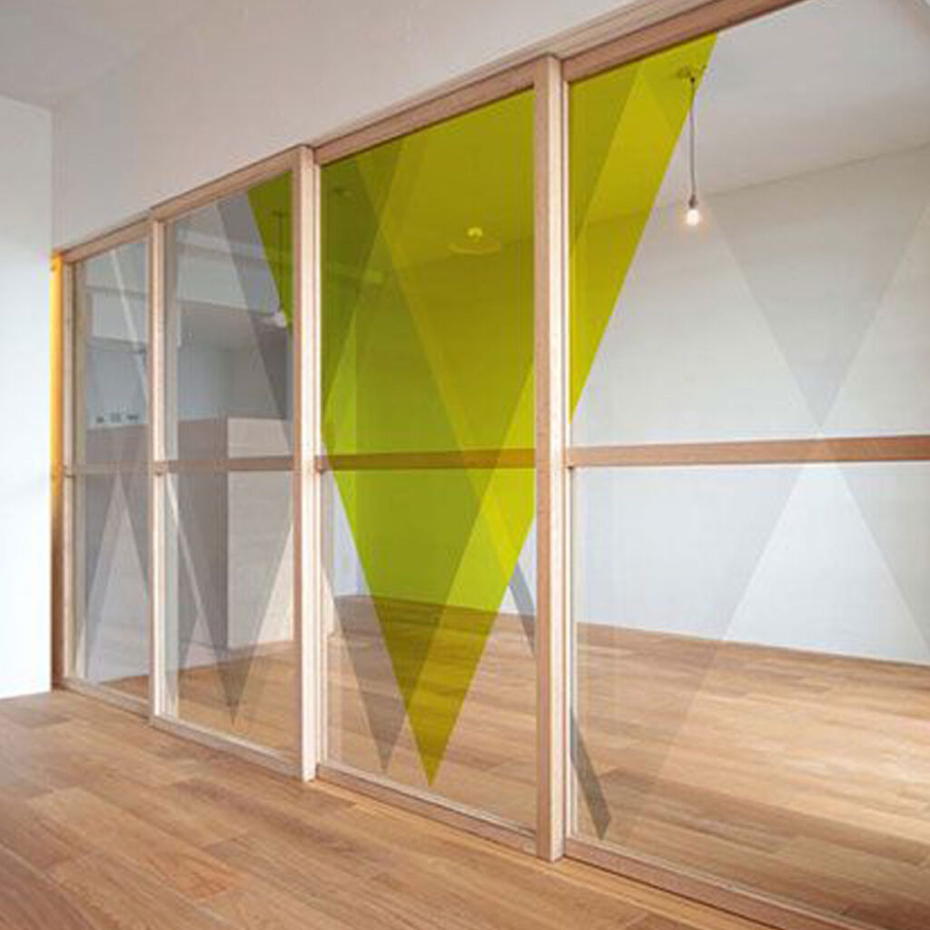 Dichroic films and gradient glass frosting are both fascinating options. Below, you can see layered dichroic film in the shape of a triangle. Imagine all the graphics and patterns! (TIP: Don’t cover glass walls with dichroic from floor to ceiling–that’s too much. It will overwhelm the room with trippy colors.) Also, look at the gradient frost–opaque at the bottom, then diffusing to clear glass at the top.
