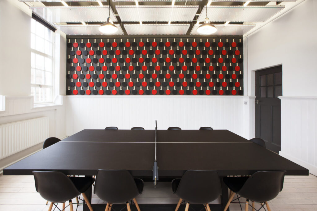 BONUS: Repetition of unexpected objects is a delight. For this office, the designer chose inexpensive ping pong paddles and hung them with precision. It has all of the interest of wallpaper, but it’s so much more playful. And did you notice the conference table is in fact a ping pong table?