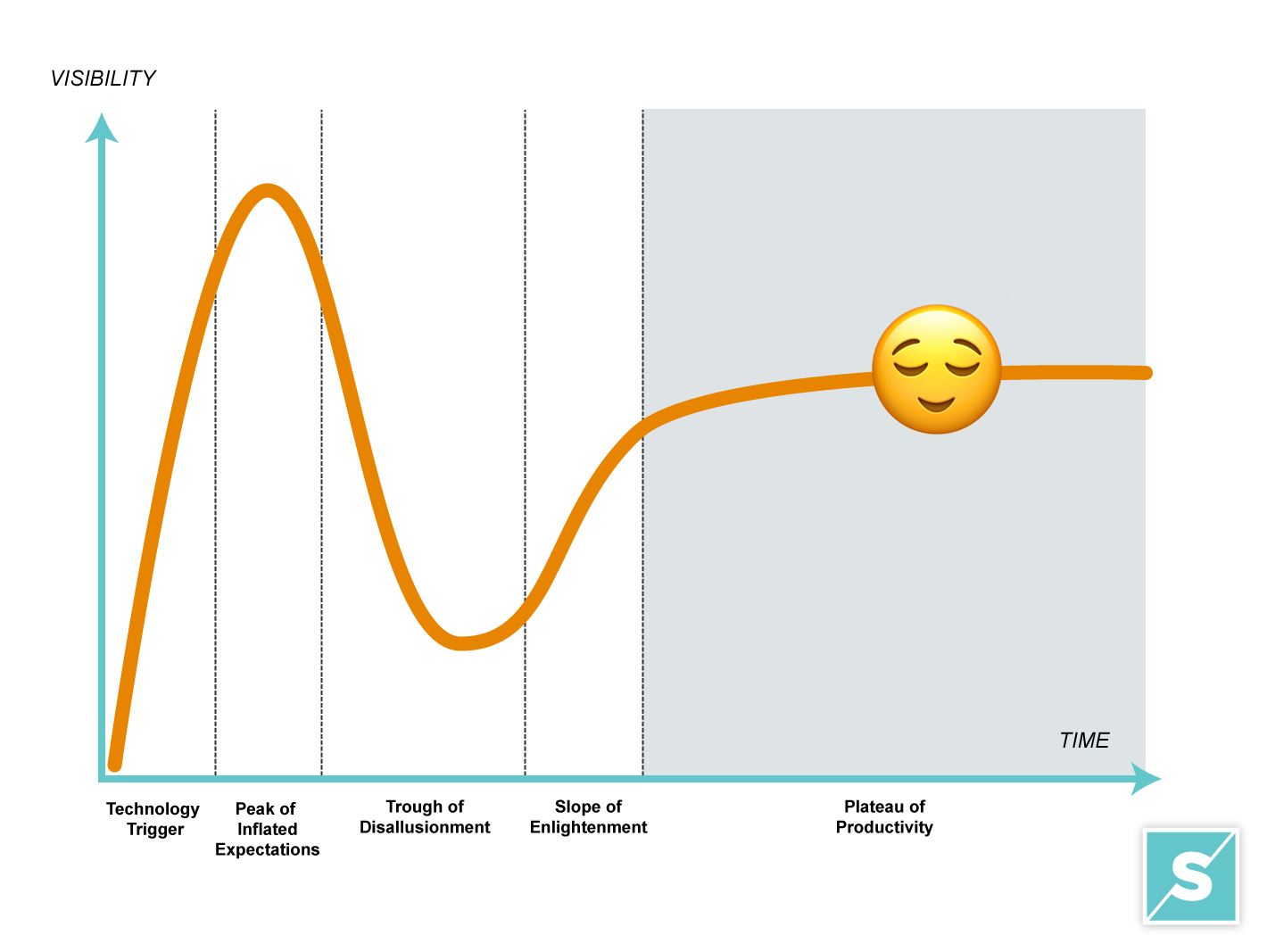 Last week in the blog, I talked about how echo chambers can create wrong-headed predictions about the future. This week, I want to talk about my favorite model for understanding the hype that surrounds a new technology: Gartner’s Hype Cycle. I’ve added emojis to their famous chart because–well–I think that it deserves it!