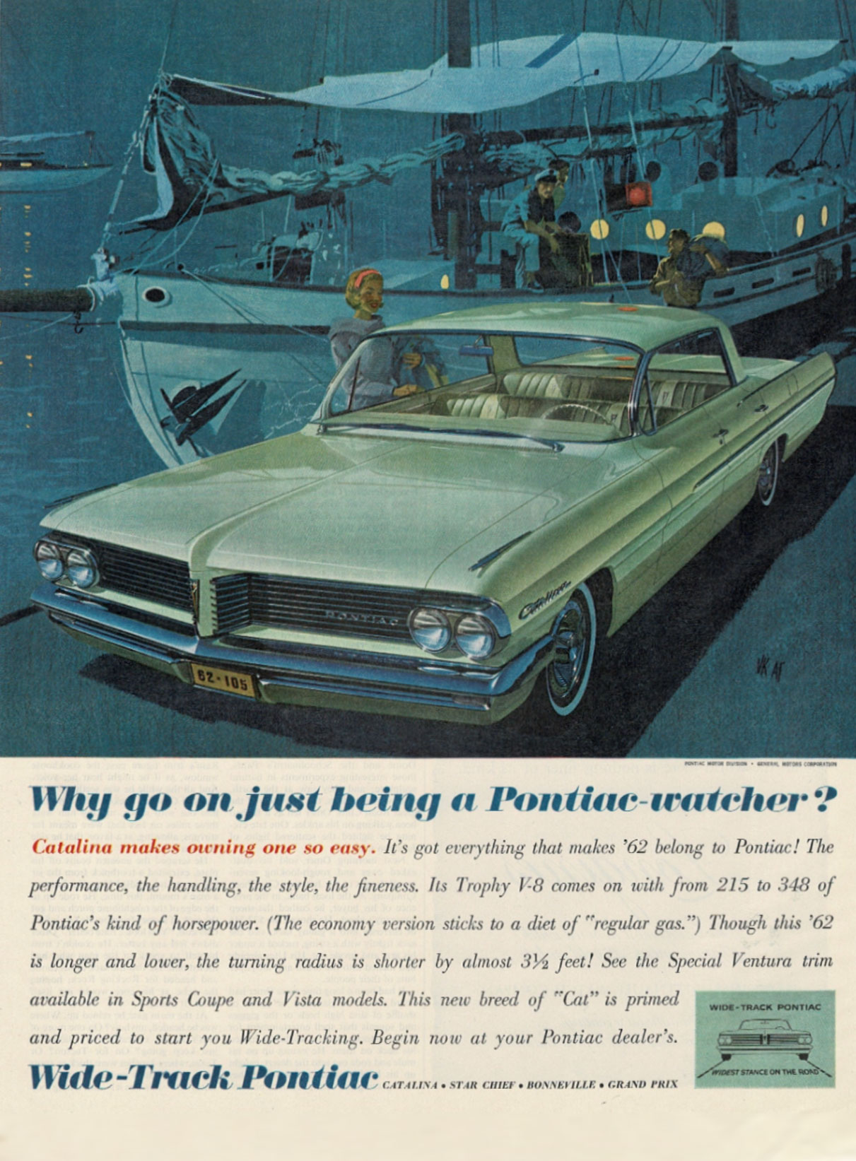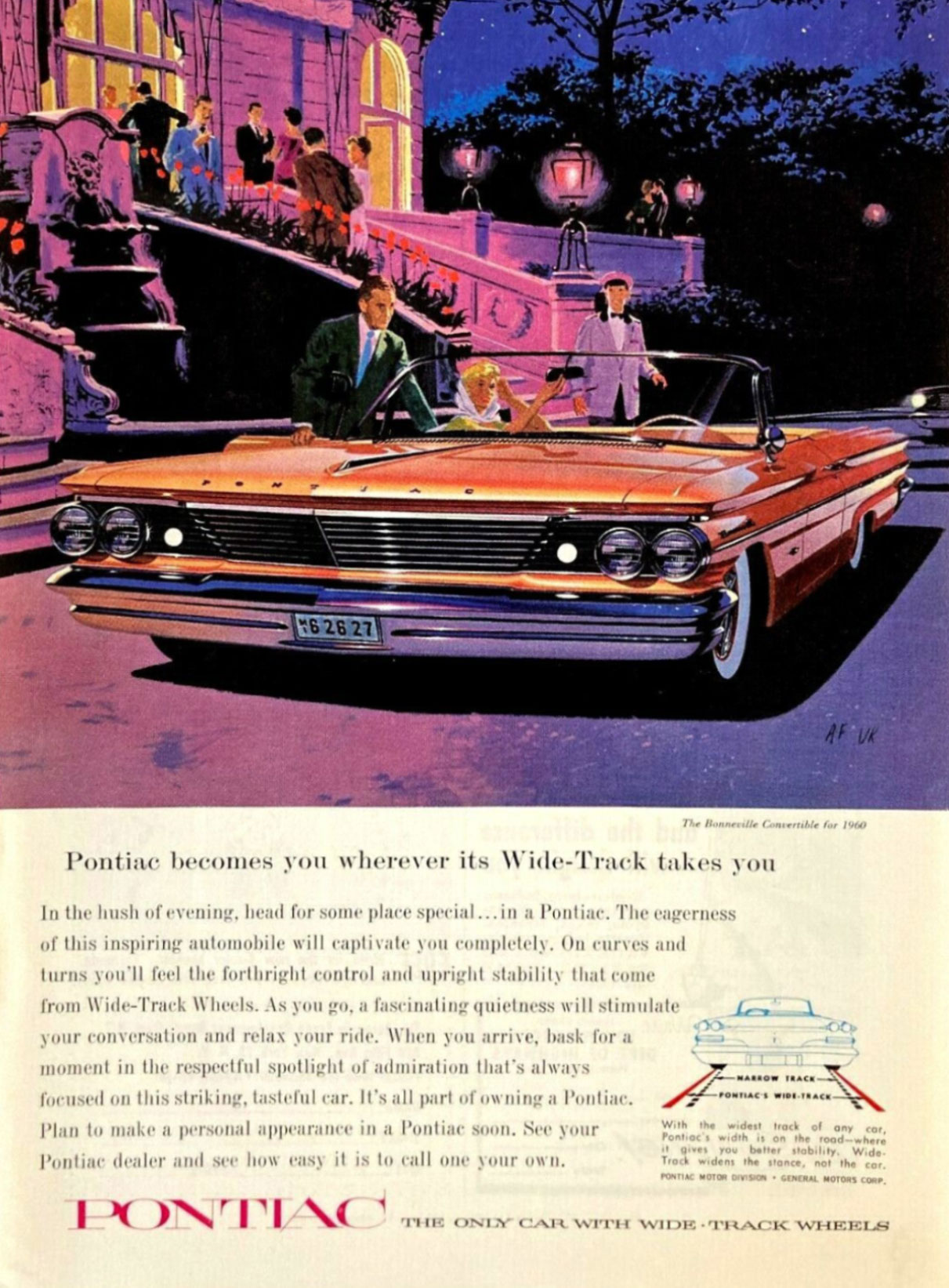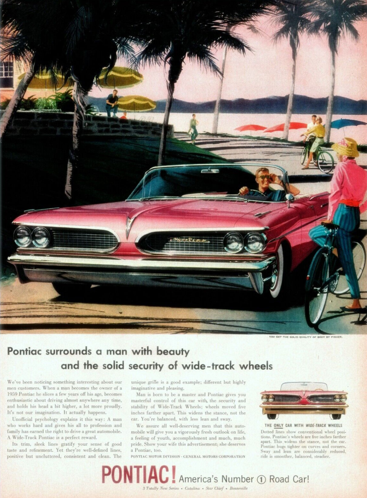 What’s interesting in this ad is they chose sunny colors for the story, but a strong black for the Pontiac itself. You can’t stop looking at it!