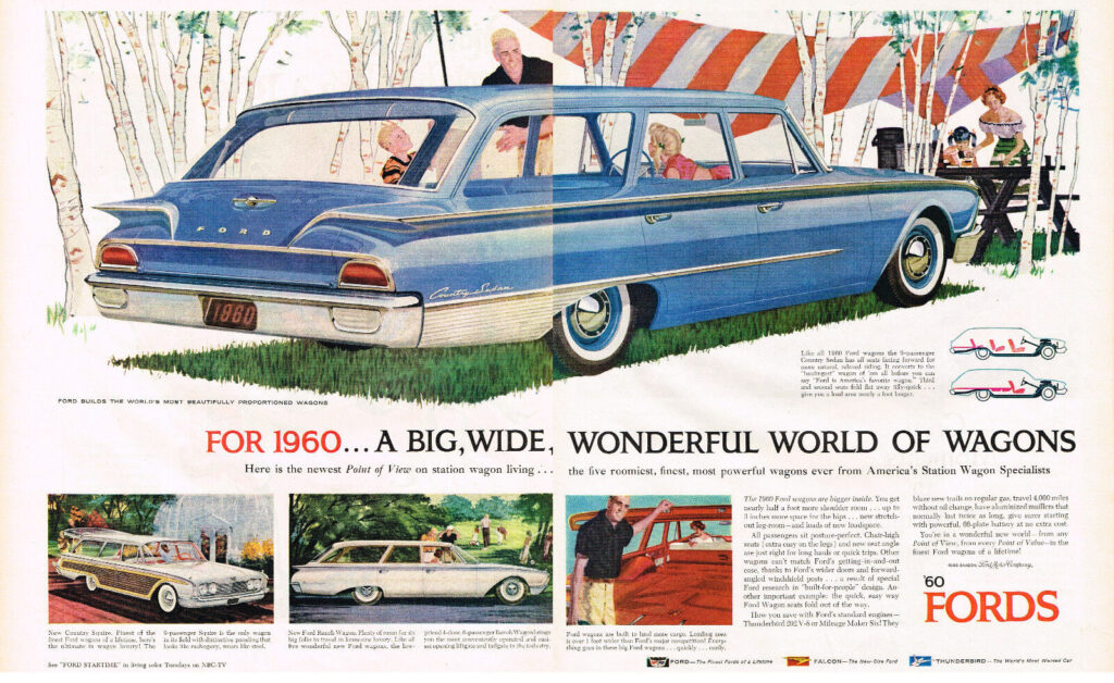 This Ford ad is not as glamorous as the work of Fritz and Kauffman, but there is still so much to love. At the top, we see a blue 1960 Ford Country Squire wagon in a dreamy scene of a family picnic. In a stand of Aspen trees, we have a striped sun canopy shading the picnic table. In the middle ground is a patient dad, unloading gear with his son. Their daughter plays safely inside the roomy new 1960 wagon, maybe she’s fiddling with the FM radio?
