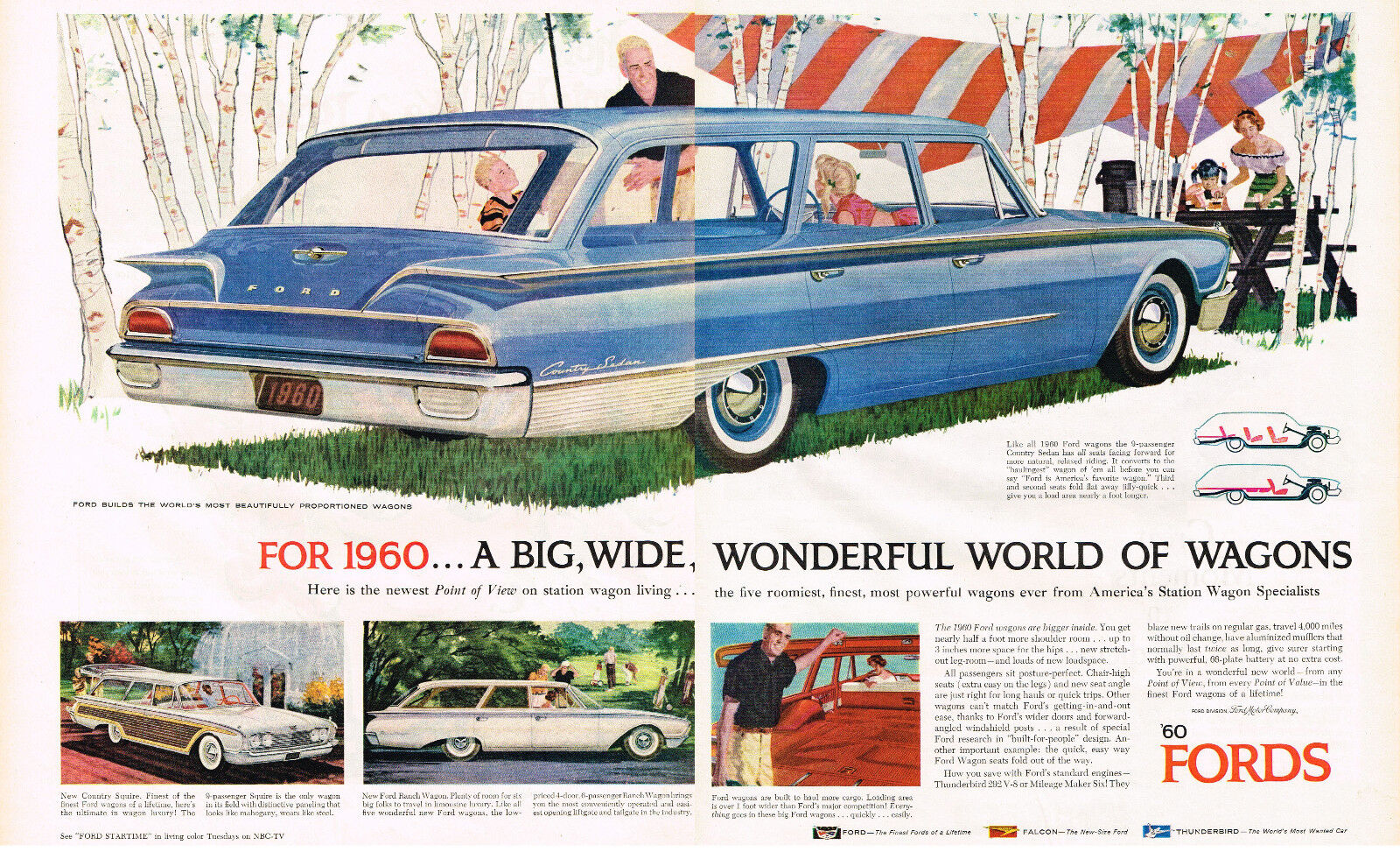 Let’s take a look at another ad for a 1960 Ford Country Squire wagon, the white one below. Notice how the 9 passengers in these illustrations are arranged to be perfectly happy–never cramped.