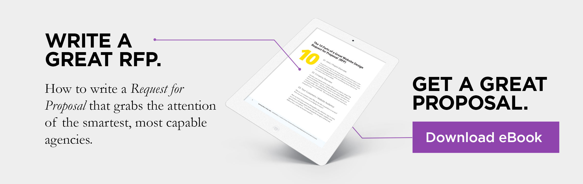 Tip: Be realistic about the timeline in which they’ll receive the RFP. It’s embarrassing to tell a Creative Director at an agency that they’ll receive an RFP this Friday and it doesn’t show up until two weeks later. If anything, tell them it will be ready by end of next week, and surprise them by emailing it to them a few days early. This shows that your company has it together and deserves 100% of their attention.